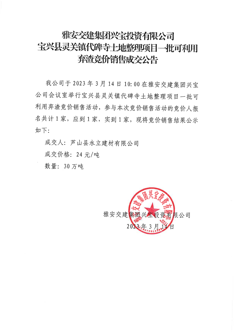 雅安交建集團(tuán)興寶投資有限公司靈關(guān)鎮(zhèn)代碑寺土地整理項(xiàng)目30萬(wàn)噸可利用棄渣競(jìng)價(jià)銷(xiāo)售成交公告(2023.3.20)