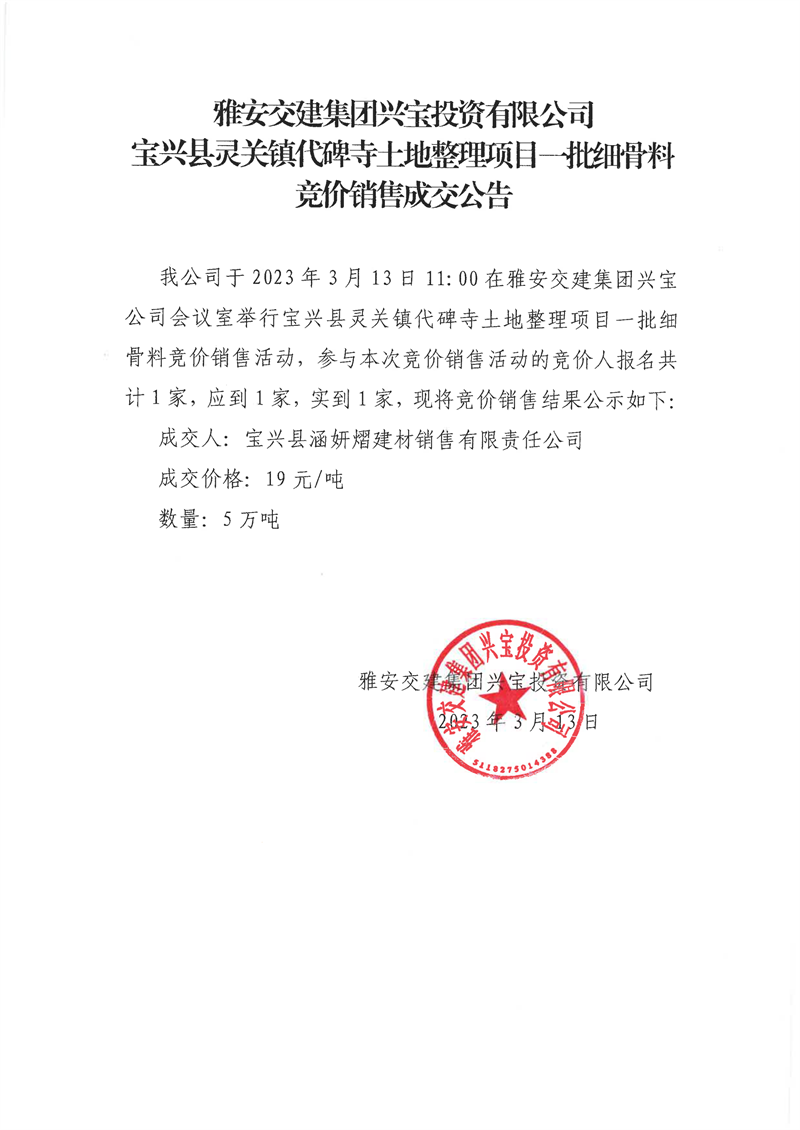 雅安交建集團(tuán)興寶投資有限公司30萬(wàn)噸可利用棄渣競(jìng)價(jià)銷(xiāo)售成交公告、5萬(wàn)噸細(xì)骨料竟價(jià)成效公告(2023.3.14)