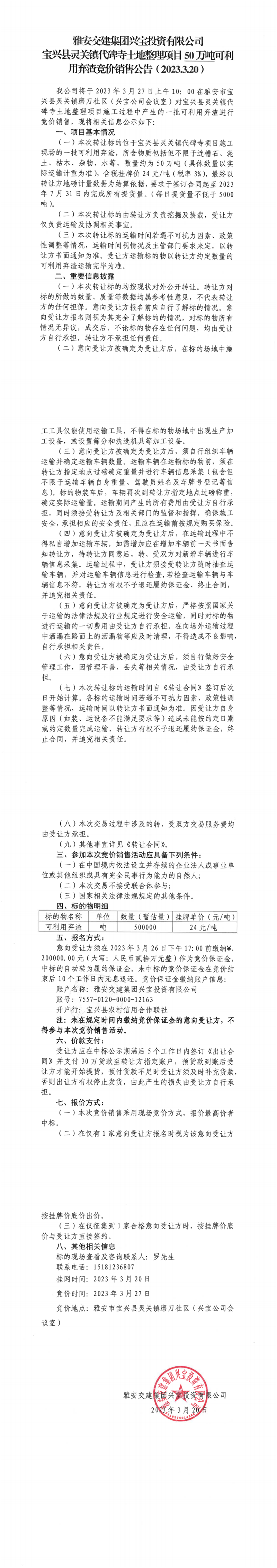 雅安交建集團(tuán)興寶投資有限公司代碑寺土地整理項(xiàng)目50萬噸可利用棄渣競價銷售公告(2023.3.20)