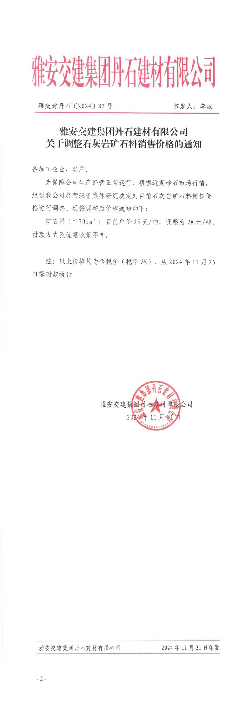 雅安交建集團(tuán)丹石公司關(guān)于調(diào)整礦石料的通知(2024-11-22)