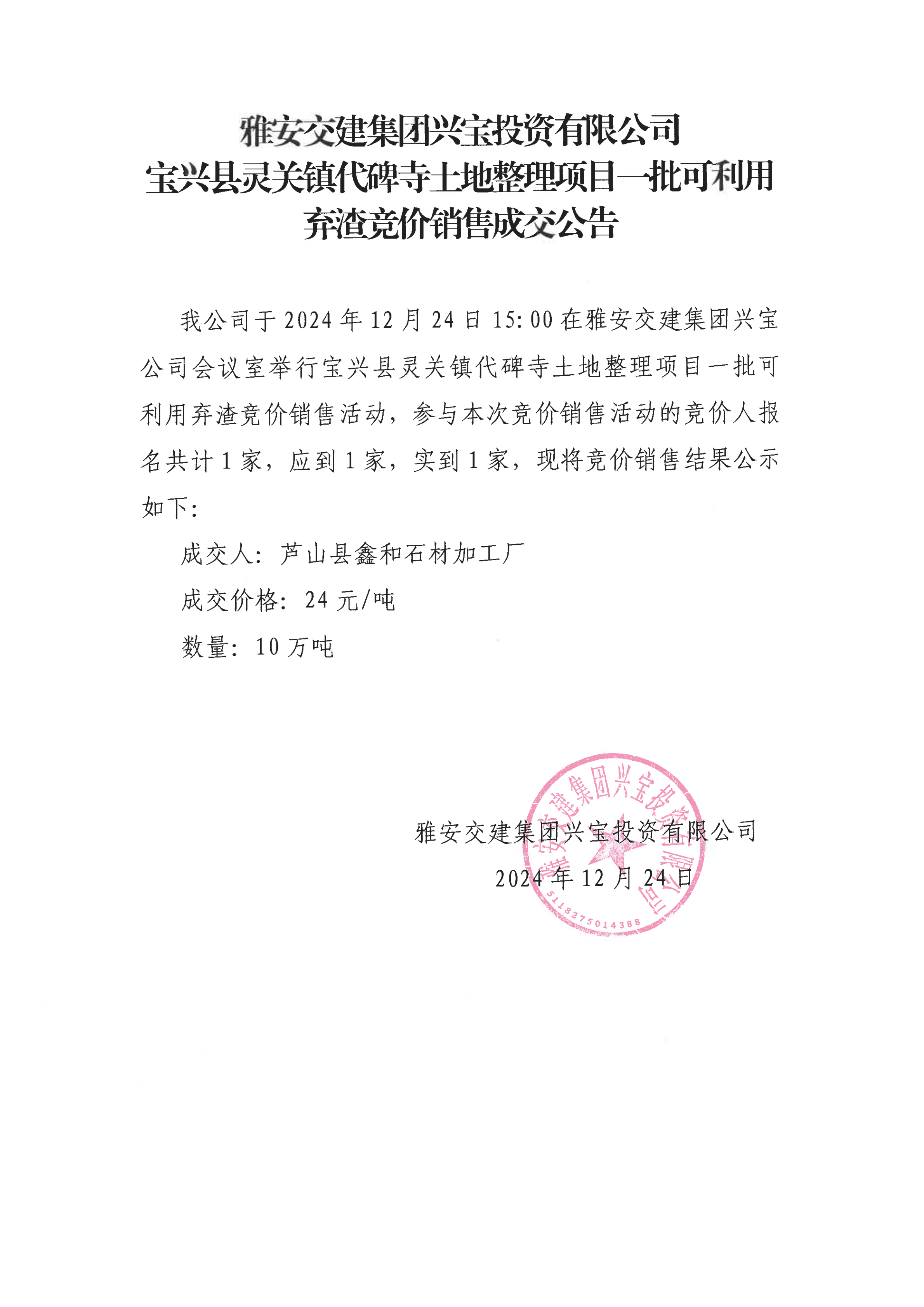 雅安交建集團興寶投資有限公司靈關鎮(zhèn)代碑寺土地整理項目10萬噸可利用棄渣成交公告(2024.12.24)